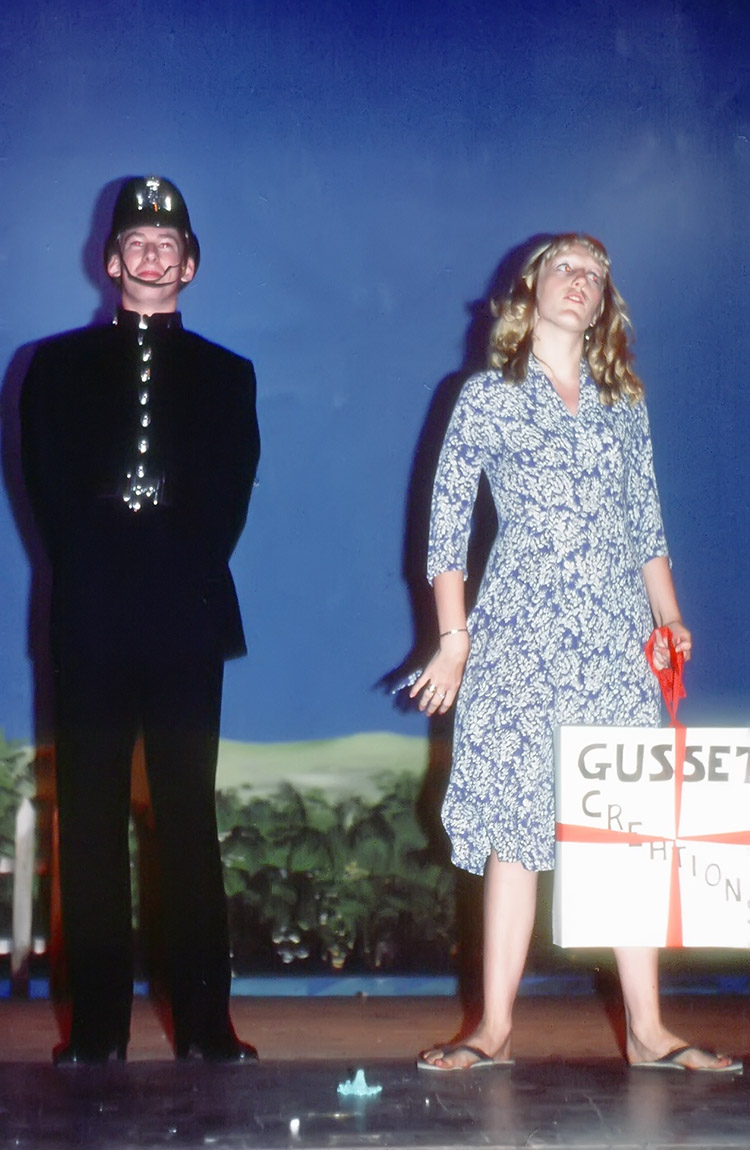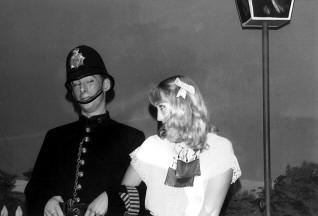 Below is a collection of images from that 1976 performance of Salad Days. Click on the thumbnail to view a larger version. Jeanne Perrett is the girl on the phone (playing "Lady Raeburn"), but she didn't attend JRGS/HS - I think she was a friend of Vernon Rees. So too was Peter Leach ("The Inspector") in the bottom photo. The girl with the Gussett Creations bag (with "PC Boot") and in the family scene near the bottom is, I believe, Lindsay Medhurst (playing "Aunt Pru" and "Rowena"). The father with the FT is Richard Mayer ("Timothy's Father"). The hairdresser and mum with the teapot is Joanna Dunn (playing several parts, including "Timothy's Mother," "Heloise," "Bishop" and "Anthea"). The girl at bottom left could be Trudi Kimish (playing "Fiona," and "Assistant"). Can anybody help identify other cast members? And here are some additional black and white images from the 1976 production of Salad Days. Again, can anybody help identify cast members? Click on any thumbnail to view a larger version.
